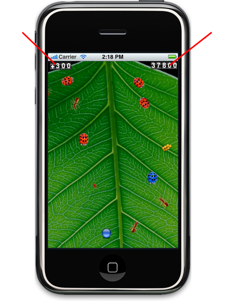 The player's total score appears in the upper right corner. The points for the last hit appears in the upper left (plus or minus). Flick-a-Bug rewards good markmenship and skill. At very close ranges, the player receives simply the base score and if too close the ball jumps over the bug for a miss. As you become a better marksmen, with distance the base score is calculated up, depending on how far away your are. Tilting to curve the ball is an additional variable and is caculated as double the base + distance. 2(base+distance)